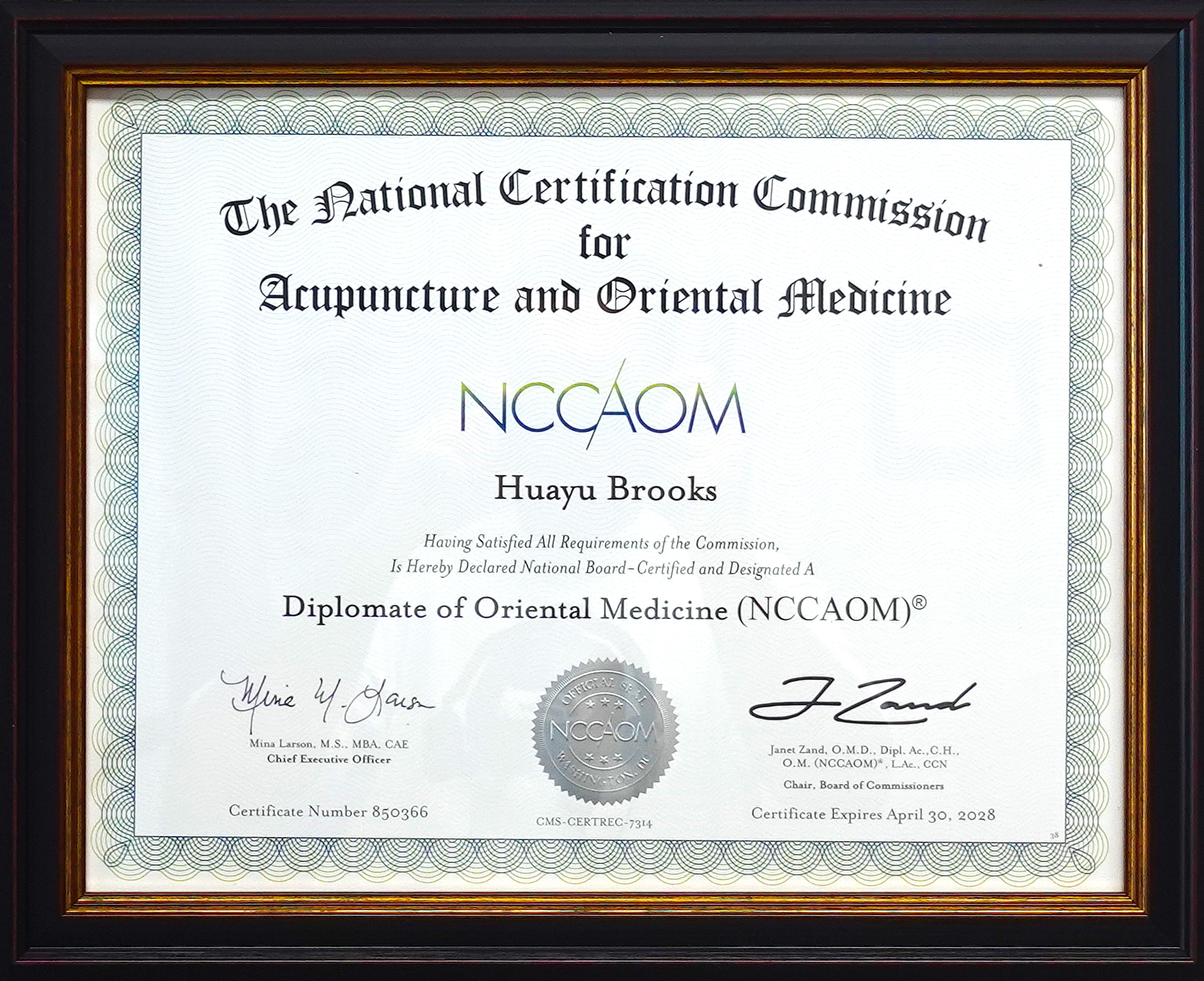 Every credential is the real thing — photographed at the South Florida TCM clinic in Boynton Beach.